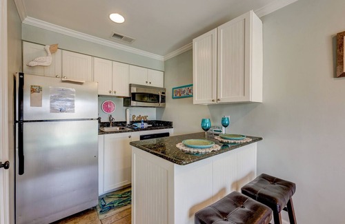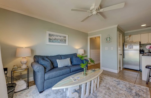 Step inside and indulge in the recent updates throughout this beautifully refreshed villa. The fully renovated kitchen features granite countertops, a breakfast bar, and modern finishes perfect for preparing meals or enjoying a quick bite before heading to the beach. The open living area includes new furnishings and a 55-inch flat-screen TV, while the cozy bedroom offers a Queen bed, wall-mounted LED TV, and sleek built-in closets for added storage. A stackable washer and dryer are conveniently located in the hallway, and the living room sofa converts into a Queen Sleeper for extra guests.
