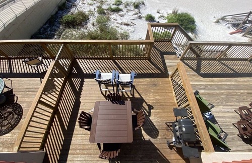 This 2-bedroom 3 full bath townhouse DIRECTLY on the beach is perfect for small families. Park in front and walk into your vacation townhome! No waiting on elevators or long walks to the beach. Just step out the back door and you are there! If sand is not your thing, enjoy the large private deck and watch the waves and the occasional school of dolphins that swim by in the evening.