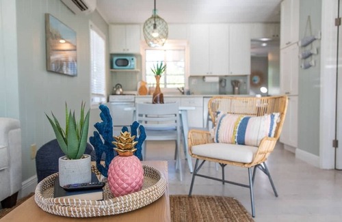 Experience relaxed coastal living at The Pink Palm, a designer bungalow just steps from the world-famous Siesta Key Beach. Thoughtfully decorated with whimsical coastal touches and curated local art, this two-bedroom retreat blends charm, comfort, and convenience. Spend your mornings with coffee on the covered porch, stroll 15 minutes to Crescent Beach, or enjoy al fresco dinners in the spacious backyard with its dining area and grill. Inside, you’ll find a cozy living room with a plush sofa and smart TV, a fully equipped kitchen with backyard views, and restful bedrooms featuring a king and queen bed. The updated bathroom is stocked with soft towels and bath products, and a washer/dryer is available on-site (shared with the adjoining unit). With its playful beach décor, modern comforts, and unbeatable location close to Siesta Key and downtown Sarasota, The Pink Palm is the perfect home base for couples, families, or small groups seeking a true Florida getaway.