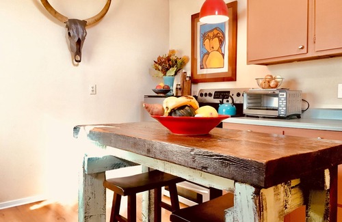 There is a living area with seating for two, suede ottoman-bench, sofa chair, and a HDTV with established Amazon Prime, Netflix and Acorn accounts for streaming TV and movies. Additionally there is a HDMI cord for guests to stream movies or shows from a laptop. Relax and unwind in this quaint setting that includes a writer's desk and a fully-stocked kitchen. Everything you need to create a gourmet meal can be found in the kitchen.