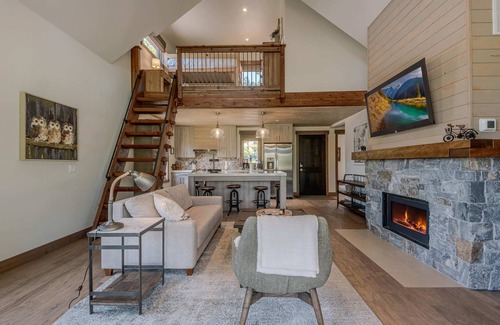 Step inside this rustic-modern retreat to a warm and welcoming living room, where a plush couch, armchair, and fireplace invite you to unwind after a day of exploring. Catch your favorite shows on cable TV or simply relax as the fire crackles in the background. The kitchen blends style and function with light cabinetry, gleaming stone countertops, stainless steel appliances, and counter seating for five—perfect for gathering over breakfast or prepping dinner together. Head outside to the covered deck and take in the fresh Montana air as you enjoy dinner at the table for six, relax on the outdoor couch, or fire up the grill for an evening barbecue. After a day on the trails or golf course, soothe your muscles in the private hot tub under the stars. The yard offers even more magic with a firepit surrounded by open space—ideal for s’mores, stargazing, or late-night storytelling.