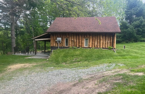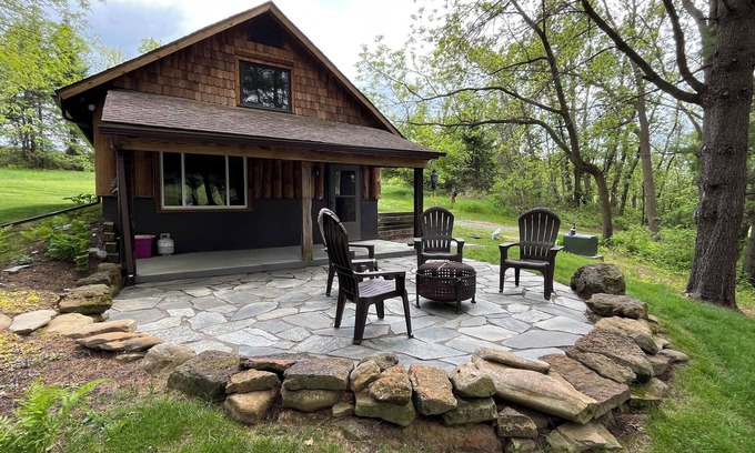 Perched by a serene pond, the cabin offers stunning views and a sense of calm that only nature can provide. The flagstone patio complements the cabin's natural surroundings, creating a harmonious blend of rugged elegance and comfort. It's an ideal spot to unwind, roast marshmallows, or simply relax after a day of exploration on the miles of mowed hiking trails on the 200-acre property where you may find delightful wild berries depending on the season.
