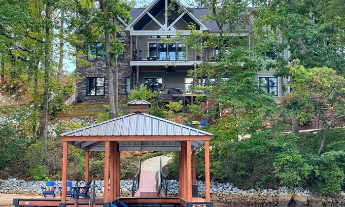 Private covered boat dock on deep water in gated community in mountainous north end Lake Keowee, with breathtaking views of the lake from virtually every room.