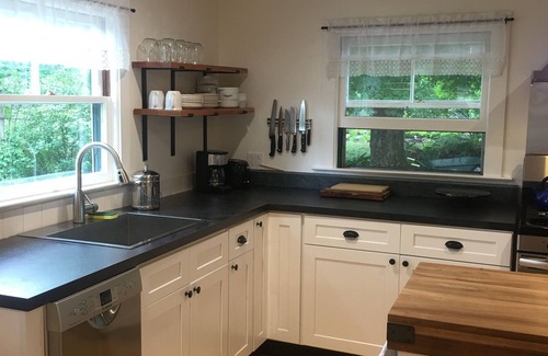 The Cottage has a large living room for sprawling out and doing puzzles, reading or playing games. The kitchen is an eat-in state of the art space with full size refrigerator , 5 burner gas stove and deep farmhouse sink. It is well stocked for all of your cooking needs.