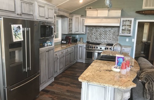 Almost 300 ft of Current River Riverfront, great for swimming, boating or floating. Custom Firepitw/grill, BBQ LP grill, Blackstone outdoor griddle, outdoor patio kitchen, eating area, large yard for kids with shade trees, Custom Daybed swing overlooking the river, wrap around porch, large patio furniture setup, private boat ramp, custom Kitchen with 48 Inch Stainless Chefs range, large couches, wifi, two large tvs with Disney plus, cbs, hulu, netflix, custom bathroom, beautiful view of the river from living room and bedrooms, sleeps 16-18. Very relaxing and peaceful.