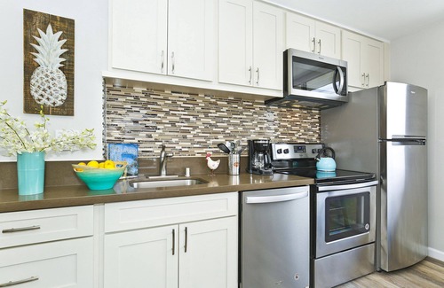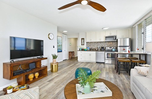Terrific views, contemporary/Hawaiian design, relaxing and close to everything! This fresh, quiet corner one-bedroom condo (635 interior sqft plus 76-sqft balcony/lanai with table and chairs) with bedroom A/C (great cross-breezes throughout!) and luxury vinyl plank flooring. Kick back as you enjoy the sunset or enjoy the easy walk to the beach, shops, and restaurants! Sleeps up to 4.