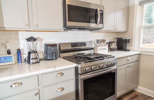 Open and Fully Stocked Kitchen: Cook up a storm in our well-equipped kitchen, featuring an open layout and stocked with everything you need.